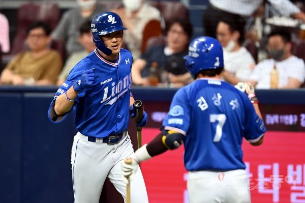 2일 서울 고척스카이돔에서 ‘2022 신한은행 SOL KBO리그’ 키움 히어로즈와 삼성 라이온즈의 경기가 열렸다. 3회초 2사에서 삼성 구자욱이 솔로 홈런을 쏘아 올린 후 동료들의 환영을 받고 있다.