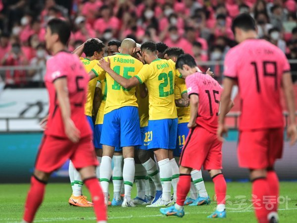 2일 서울월드컵경기장에서 열린 ‘하나은행 초청 축구국가대표팀 친선경기’ 한국과 브라질의 경기에서 브라질 제주스의 다섯 번째 골에 선수들이 기쁨을 나누고 있다.