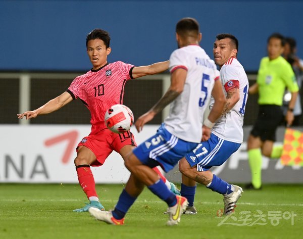 6일 대전월드컵경기장에서 열린 한국축구대표팀과 칠레의 평가전에서 한국 정우영이 문전으로 볼을 올리고 있다.