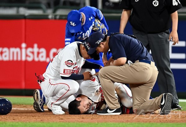 7일 부산 사직야구장에서 ‘2022 신한은행 SOL KBO리그’ 롯데 자이언츠와 삼성 라이온즈의 경기가 열렸다. 6회말 무사에서 롯데 황성빈이 투수 앞 땅볼 타구를 날린 후 1루에서 삼성 오재일과 충돌 후 고통을 호소하고 있다.