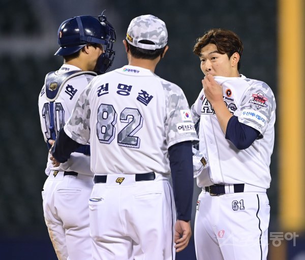 8일 서울 잠실야구장에서 열린 ‘2022 신한은행 SOL KBO리그’ 두산 베어스와 한화 이글스의 경기에서 6회초 무사 한화에 2루타를 허용한 두산 최원준이 코치와 이야기를 하고 있다.