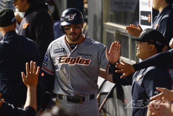 8일 서울 잠실야구장에서 열린 ‘2022 신한은행 SOL KBO리그’ 두산 베어스와 한화 이글스의 경기에서 8회초 무사 2루 한화의 좌전 적시타 때 2루주자 터크먼이 득점에 성공한 후 더그아웃에서 동료들의 축하를 받고 있다.