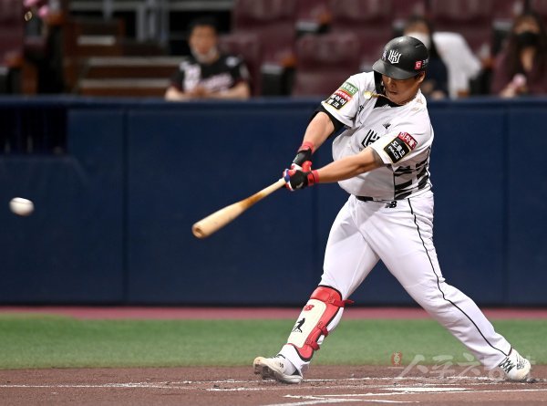 9일 서울 고척스카이돔에서 ‘2022 신한은행 MY CAR KBO리그’ KT 위즈와 키움 히어로즈 경기가 열렸다. 1회초 1사 1루 KT 강백호가 우전 2루타를 치고 있다.