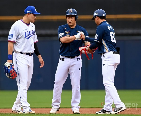 10일 대구 삼성라이온즈파크에서 ‘2022 신한은행 SOL KBO리그’ 삼성 라이온즈와 NC 다이노스의 경기가 열렸다. 1회초 2사 2루에서 NC 양의지가 1타점 2루타를 날린 후 코치의 환영을 받고 있다.