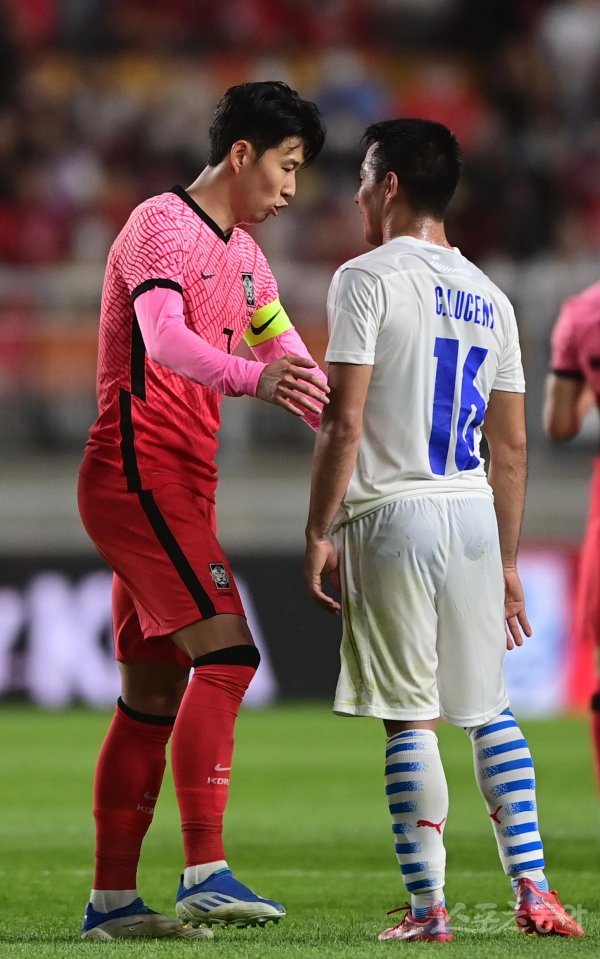 10일 수원월드컵경기장에서 열린 ‘하나은행 초청 축구국가대표팀 친선경기’ 한국과 파라과이의 경기에서 파라과이에 2-2로 무승부를 기록한 한국 손흥민이 루세나와 이야기를 하고 있다.