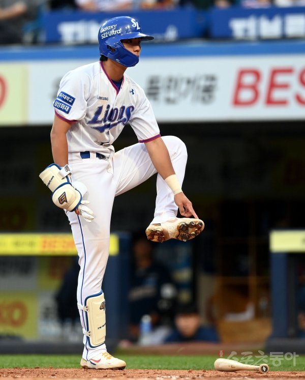 11일 대구 삼성라이온즈파크에서 ‘2022 신한은행 SOL KBO리그’ 삼성 라이온즈와 NC 다이노스의 경기가 열렸다. 8회말 무사에서 삼성 김현준이 투구에 맞았다고 심판에게 이야기 하고 있다.