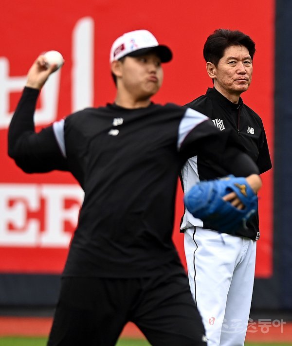 15일 경기도 수원 kt위즈파크에서 ‘2022 신한은행 SOL KBO리그’ kt 위즈와 SSG 랜더스의 경기가 열린다. 경기 전 kt 이강철 감독이 소형준의 투구를 바라보고 있다.