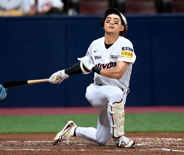 16일 서울 고척스카이돔에서 ‘2022 신한은행 SOL KBO리그’ 키움 히어로즈와 두산 베어스의 경기가 열렸다. 3회말 2사 1, 2루에서 키움 이정후가 헛스윙을 하고 있다.