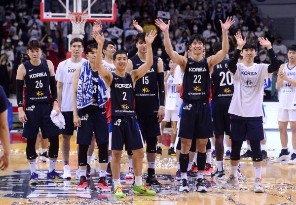 18일 안양실내체육관에서 열린 남자농구 국가대표팀과 필리핀 남자농구 국가대표팀 평가전에서 106-102 승리를 거둔 한국 선수들이 기뻐하고 있다.