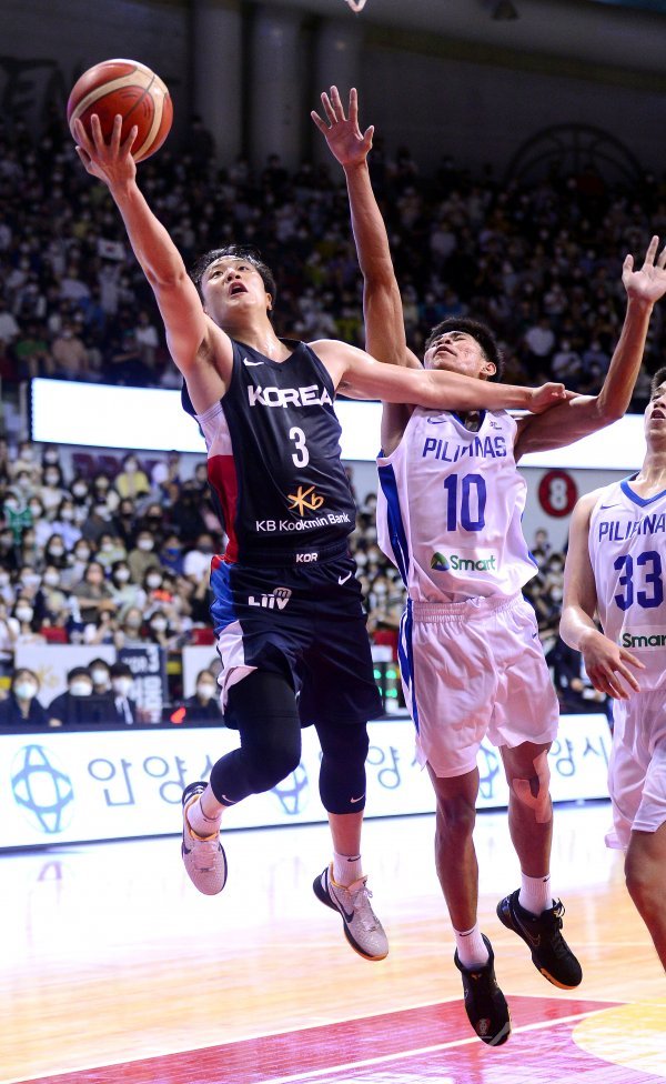 18일 안양실내체육관에서 열린 남자농구 국가대표팀과 필리핀 남자농구 국가대표팀 평가전에서 한국 허웅이 필리핀의 수비를 뚫고 골밑 슛을 하고 있다.