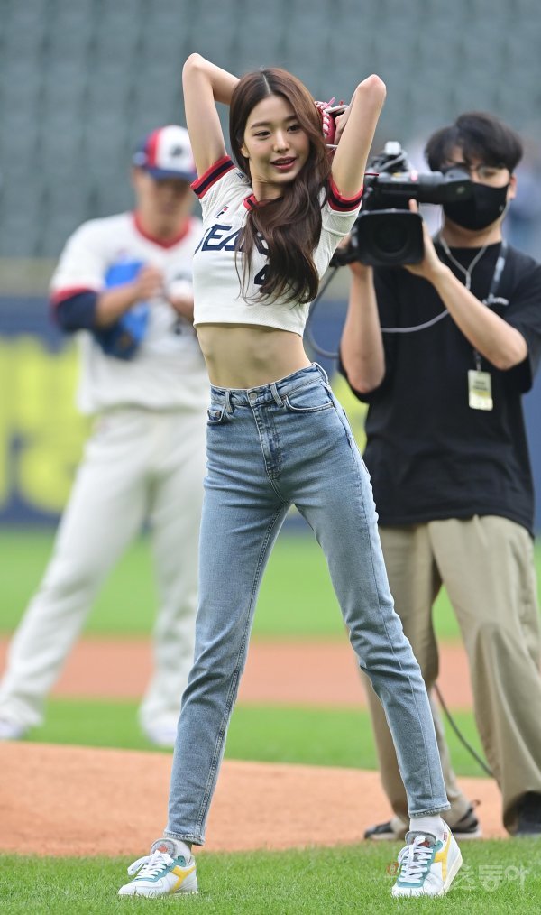 19일 서울 잠실야구장에서 열린 ‘2022 신한은행 SOL KBO리그’ 두산 베어스와 KT 위즈의 경기에 앞서 아이브 장원영이 시구를 하고 있다.