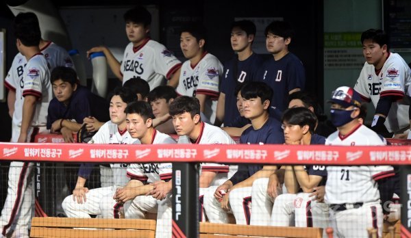 19일 서울 잠실야구장에서 열린 ‘2022 신한은행 SOL KBO리그’ 두산 베어스와 KT 위즈의 경기에서 KT에 1-7로 패한 두산 선수들이 더그아웃에서 경기를 지켜보고 있다.