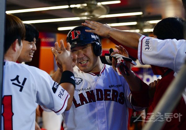 22일 인천 SSG 랜더스필드에서 ‘2022 신한은행 SOL KBO리그’ SSG 랜더스와 두산 베어스의 경기가 열렸다. 5회말 2사 1, 2루에서 2루타 때 SSG 이재원이 득점을 올린 후 동료들의 환영을 받고 있다.