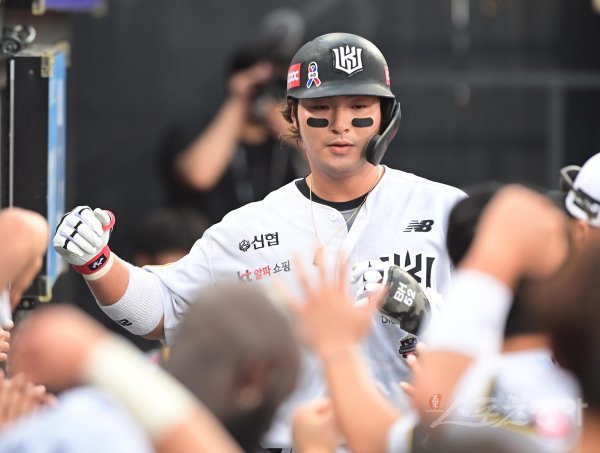 26일 경기도 수원KT위즈파크에서 열린 ‘2022 신한은행 SOL KBO리그’ KT 위즈와 LG 트윈스의 경기에서 4회말 1사 KT 박병호가 좌월 솔로 홈런을 쳐낸 후 더그아웃에서 동료들의 축하를 받고 있다.
