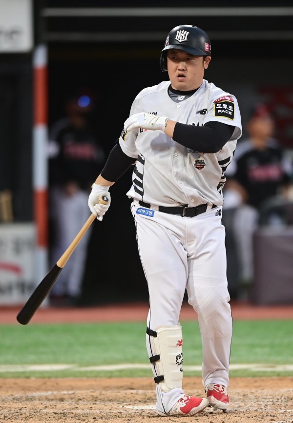 26일 경기도 수원KT위즈파크에서 열린 ‘2022 신한은행 SOL KBO리그’ KT 위즈와 LG 트윈스의 경기에서 7회말 2사 1, 2루 KT 김준태가 헛스윙 삼진 아웃을 당하고 있다.
