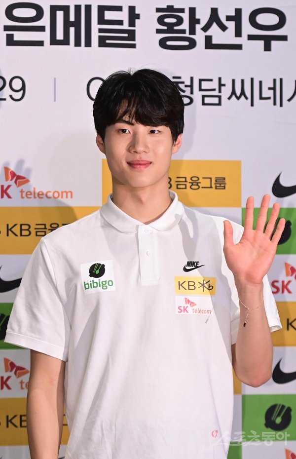 수영 선수 황선우가 29일 서울 강남구 신사동 CGV 청담씨네시티에서 열린 ‘2022 국제수영연맹(FINA) 부다페스트 세계선수권대회’ 자유형 200m에서 은메달 획득 기자간담회에서 포즈를 취하고 있다.