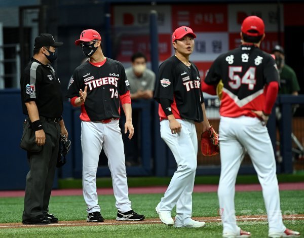 29일 서울 고척 스카이돔에서 ‘2022 신한은행 SOL KBO리그’ 키움 히어로즈와 KIA 타이거즈의 경기가 열렸다. 7회말 무사 1루에서 키움 번트 파울타구에 대해 KIA 김종국 감독이 심판에게 항의하고 있다.