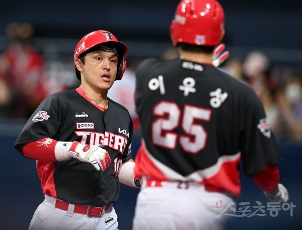 30일 서울 고척스카이돔에서 ‘2022 신한은행 MY CAR KBO리그’ KIA 타이거즈와 키움 히어로즈 경기가 열렸다. 6회말 1사 1루 KIA 박동원이 우월 투런 홈런을 날리고 그라운드를 돌아 홈인해 하이파이브 하고 있다.