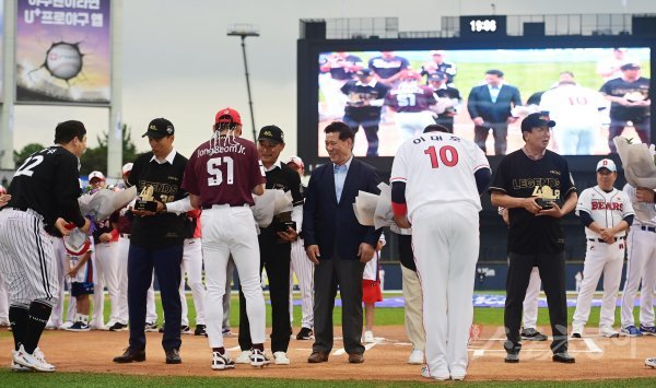 16일 서울 잠실야구장에서 열린 ‘2022 KBO 올스타전’ 드림 올스타와 나눔 올스타의 경기에 앞서 레전드 4인으로 선정된 이승엽, 이종범, 최동원을 대신해 아들 최기호 씨, 선동열이 선수들로부터 꽃다발을 받고 있다.