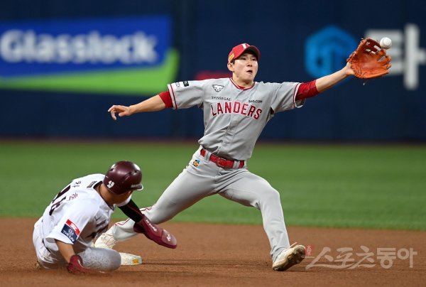 2일 서울 고척스카이돔에서 ‘2022 신한은행 MY CAR KBO리그’ SSG 랜더스와 키움 히어로즈 경기가 열렸다. 4회말 무사 1루 키움 내야 땅볼 때 SSG 박성한이 1루주자를 포스 아웃시키고 있다.