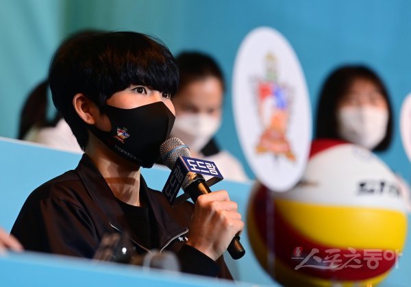 19일 서울 강남구 청담동 호텔리베라청담에서 열린 ‘도드람 2022-2023 V-리그’ 여자부 개막 미디어데이에서 KGC인삼공사 이소영이 인사말을 하고 있다.