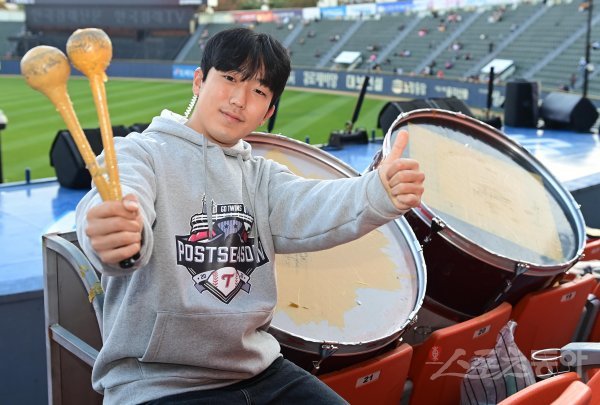 한정석 씨(23)는 LG 응원단 중에서도 북을 치는 ‘고수’들의 진행을 총괄하고 있다. 2018년부터 북채를 잡아온 그는 고수로 활약해온 것은 물론 2020년부터는 응원단 진행 관리까지 맡아 LG 응원에선 없어선 안 될 인물이다.