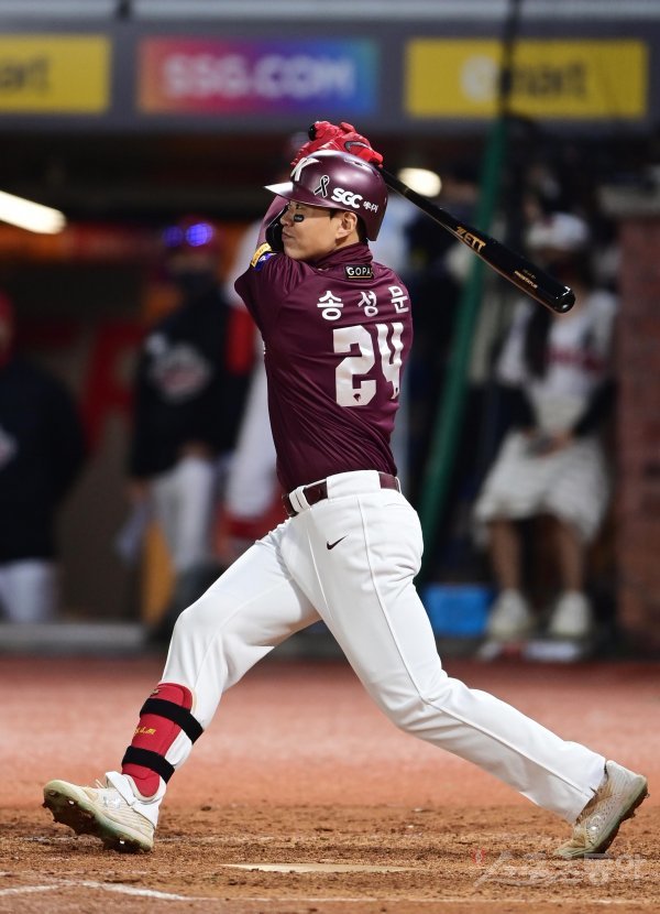 1일 인천 SSG랜더스필드에서 열린 ‘2022 신한은행 SOL KBO리그’ 한국시리즈 1차전 SSG 랜더스와 키움 히어로즈의 경기에서 5회초 2사 1루 키움 송성문이 우전 안타를 치고 있다.