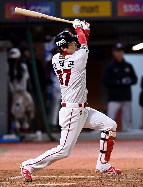1일 인천 SSG 랜더스필드에서 ‘2022 신한은행 SOL KBO리그’ SSG 랜더스와 키움 히어로즈의 한국시리즈 1차전 경기가 열렸다. 8회말 무사 2, 3루에서 SSG 오태곤이 1타점 역전 희생플라이를 날리고 있다.