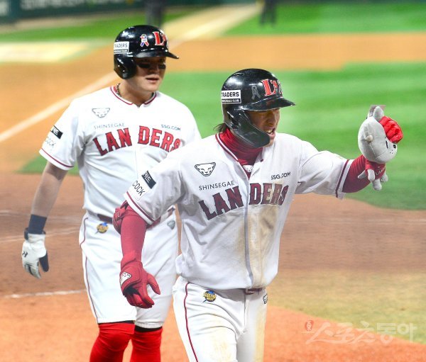 2일 인천 SSG랜더스필드에서 ‘2022 신한은행 MY CAR KBO리그’ 한국시리즈 2차전 키움 히어로즈와 SSG 랜더스 경기가 열렸다. 5회말 1사 1루 SSG 최지훈이 우월 투런 홈런을 날리고 그라운드를 돌아 홈인해 하이파이브 하고 있다.
