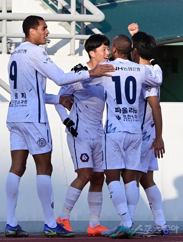 1일 서울 목동운동장 주경기장에서 열린 ‘하나원큐 K리그2 2023’ 서울 이랜드FC와 충북청주FC의 경기에서 충북청주 문상윤이 추가골을 성공시킨 후 동료들의 축하를 받고 있다.