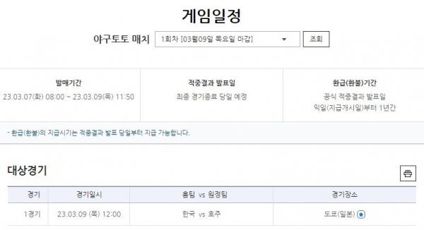 WBC, B조 1라운드 첫 경기 한국-호주전 대상 2023년 첫 야구토토 매치 발매