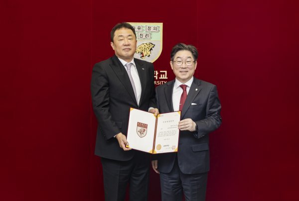 전창진 전주 KCC 감독이 고려대학교 발전기금으로 1억 원을 쾌척했다. 고려대 경영학과 82학번인 전 감독은 6일 고려대 본관 총장실에서 진행한 발전기금 기부식에서 “모교의 후배들에게 조금이나마 도움이 됐으면 좋겠다는 생각에 기부를 결정했다. 2023 정기 고연전의 전승과 더불어 고려대의 건승을 빈다”고 밝혔다. 김동원 고려대 총장은 “따뜻한 나눔에 감사드린다. 감독님의 소중한 기부가 고려대 발전의 소중한 주춧돌이 될 것”이라고 기대했다. 발전기금 기부식 후 기념촬영을 한 전 감독(왼쪽)과 김 총장.