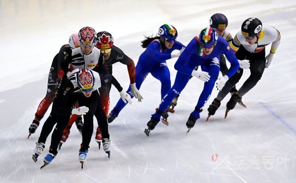 12일 서울 목동 아이스링크에서 열린 ‘2023 KB금융 국제빙상경기연맹(ISU) 쇼트트랙 세계선수권대회’ 혼성 2000m 준결승전 경기에서 한국 김건희가 이준서에게 터치하고 있다.