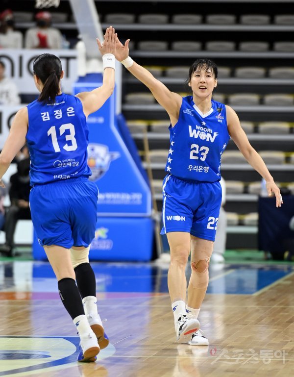 19일 아산이순신체육관에서 열린‘신한은행 SOL 2022~2023 여자프로농구‘ 챔피언결정전 1차전 우리은행과 BNK 썸 경기에서 우리은행 김단비가 3점슛을 성공시킨 후 기뻐하고 있다.