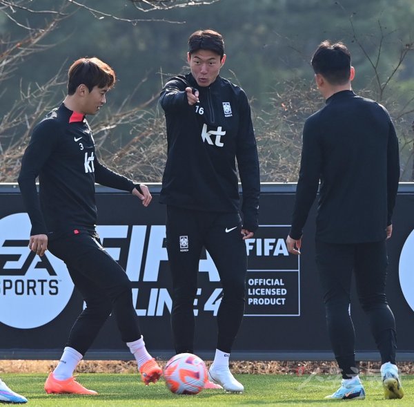 한국축구대표팀이 20일 경기도 파주 축구대표팀트레이닝센터(NFC)에서 콜롬비아와 우루과이의 친선경기에 앞서 소집훈련을 진행했다. 한국 황의조가 김진수에게 장난을 치고 있다.