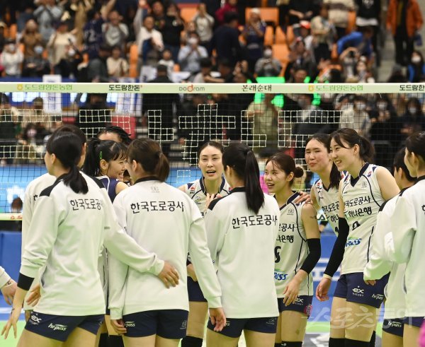 23일 수원체육관에서 열린 ‘2022~2023 도드람 V-리그’ 여자부 플레이오프 1차전 현대건설과 한국도로공사 경기에서 세트스코어 3-1 승리를 거둔 한국도로공사 선수들이 기뻐하고 있다. 수원 | 김종원 기자 won@donga.com