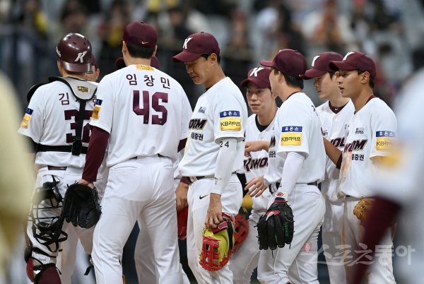 26일 서울 고척스카이돔에서 2023 KBO리그 시범경기 LG 트윈스와 키움 히어로즈 경기가 열렸다. 4-2 승리를 거둔 키움 선수들이 하이파이브 하고 있다.