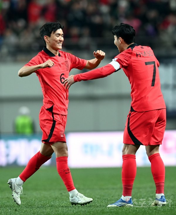 28일 서울 마포구 서울월드컵경기장에서 한국과 우루과이의 축구대표팀 평가전에서 한국 황인범이 동점골을 넣은 후 손흥민과 기쁨을 나누고 있다.