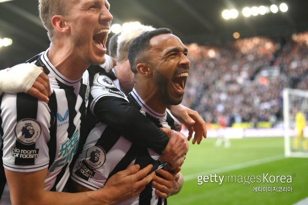 뉴캐슬의 칼럼 윌슨(오른쪾)이 2-0으로 달아나는 쐐기골을 터뜨린 후 동료들과 기쁨을 나누고 있다. 사진=게티이미지코리아.