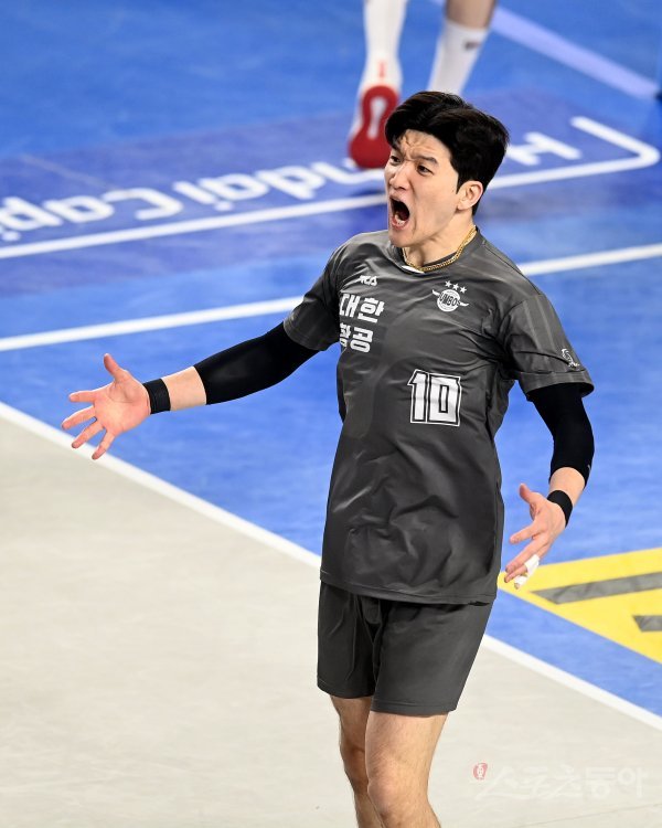 3일 천안 유관순체육관에서 열린 ‘2022~2023 도드람 V-리그’ 남자부 챔피언결정전 3차전 현대캐피탈과 대한항공 경기에서 대한항공 정지석이 득점에 성공한 후 기뻐하고 있다.