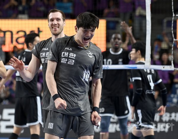 3일 천안 유관순체육관에서 열린 ‘2022~2023 도드람 V-리그’ 남자부 챔피언결정전 3차전 현대캐피탈과 대한항공 경기에서 대한항공 정지석이 득점에 성공한 후 기뻐하고 있다.