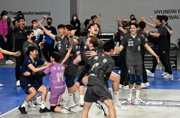 3일 천안 유관순체육관에서 열린 ‘2022~2023 도드람 V-리그’ 남자부 챔피언결정전 3차전 현대캐피탈과 대한항공 경기에서 대한항공이 세트스코어 3-2 역전승을 거두며 3년 연속 통합 우승을 달성했다.