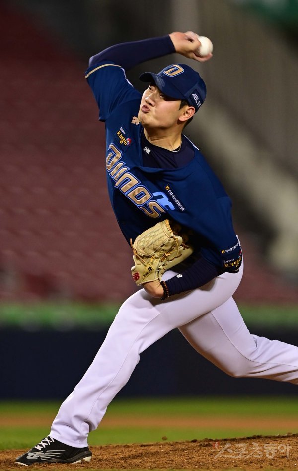 18일 서울 잠실야구장에서 열린 ‘2023 신한은행 SOL KBO리그’ LG 트윈스와 NC 다이노스의 경기에서 9회말 NC 김시훈이 교체로 마운드에 올라 역투하고 있다.