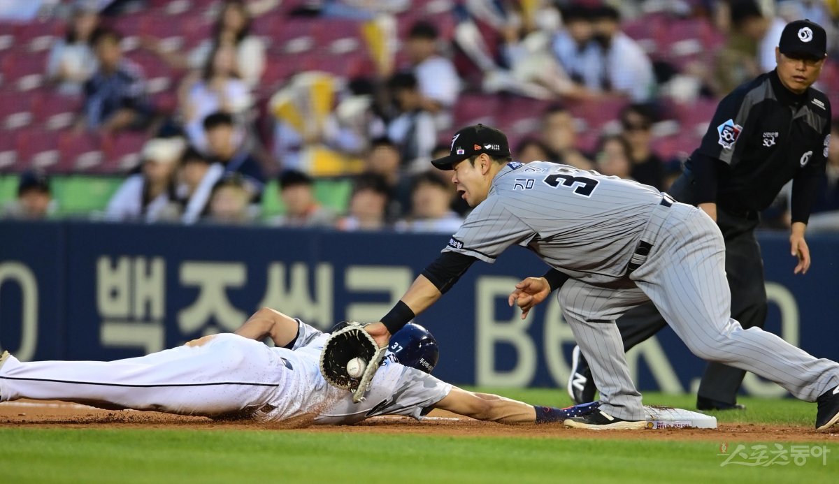 8일 서울 잠실야구장에서 열린 ‘2023 신한은행 SOL KBO리그’ 두산 베어스와 한화 이글스의 경기에서 3회말 2사 1루 상황에서 한화 김인환이 투수의 견제구를 잡고 있다.
