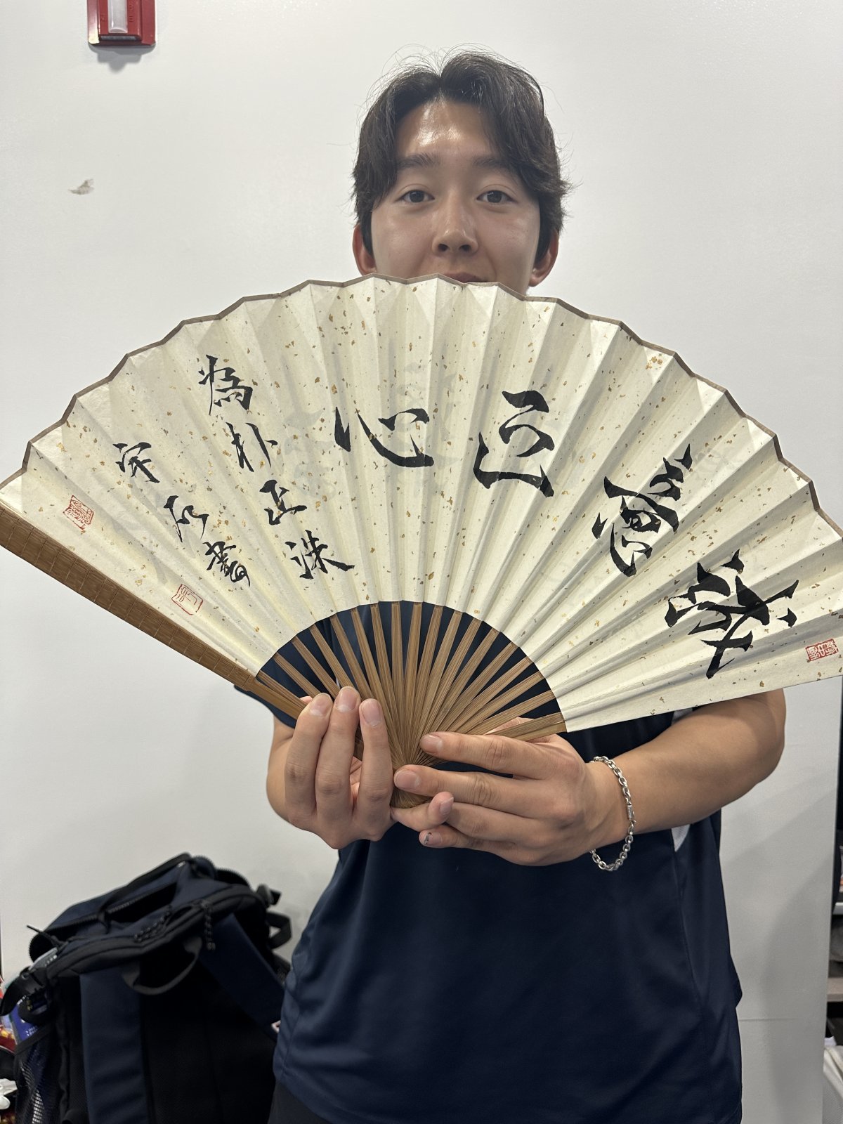 곽빈은 “이런 선물은 처음 받아본다”며 “선수 개개인의 한자까지 찾아 직접 멋진 글씨를 새겨주신 정성에 감동했다. 커피도 시원하게 잘 마셨다. 부채에 적힌 대로 공 하나마다 열심히 던져 팀의 반등을 위해 노력하겠다”고 다짐했다.