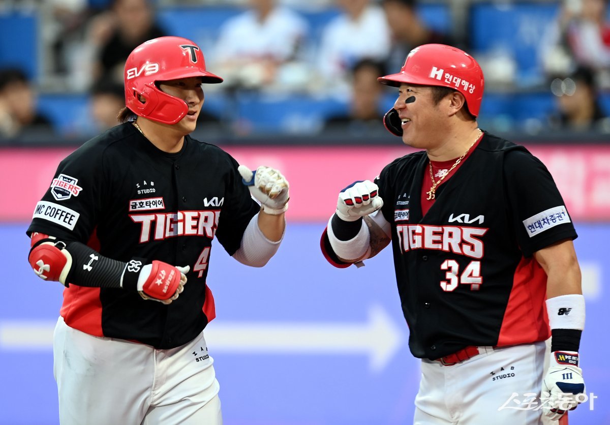 9일 경기도 수원 kt위즈파크에서 ‘2023 신한은행 SOL KBO리그’ kt 위즈와 KIA 타이거즈의 경기가 열렸다. 7회초 2사 1루에서 KIA 나성범이 투런 홈런을 쏘아 올린 후 최형우의 환영을 받고 있다.