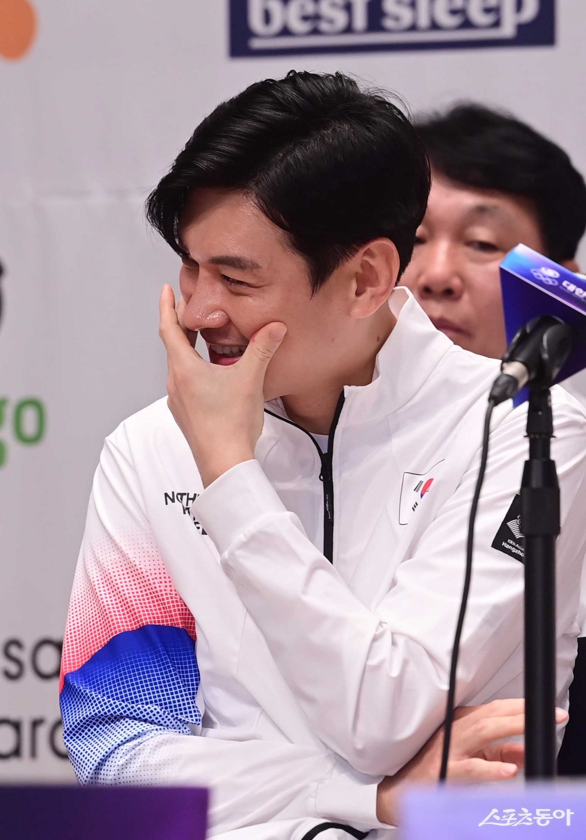 한국펜싱대표팀 구본길이 24일 충북 진천국가대표선수촌에서 열린 ‘2022 항저우아시아경기대회 D-30 미디어데이’ 기자회견에서 동료의 이름으로 소개되자 웃고 있다.
