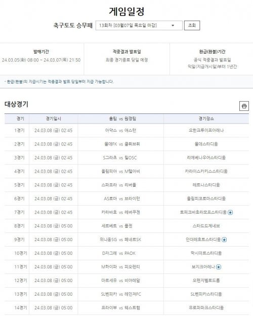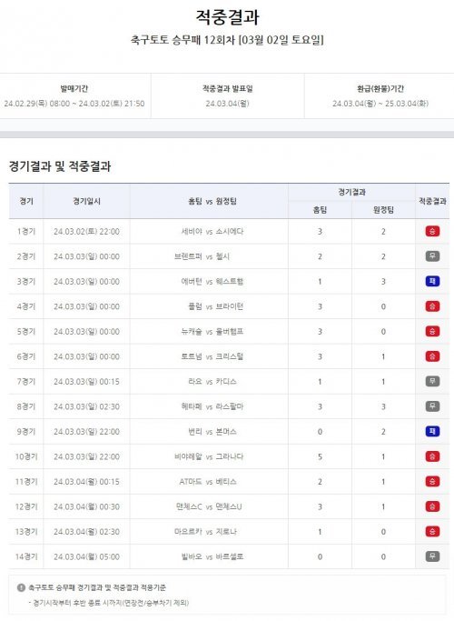 한편 축구토토 승무패 12회차 적중에 성공한 축구팬들은 2025년 3월 4일(화)까지 1년 이내에 전국 토토판매점 또는 우리은행 지점에서 적중금을 찾아갈 수 있으며, 이어지는 축구토토 승무패 13회차는 5일(화) 오전 8시부터 구매가 가능하다.