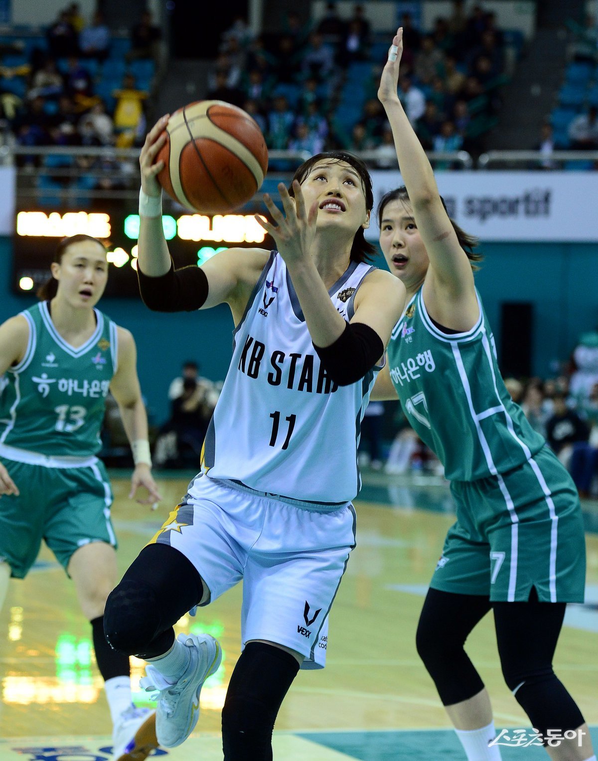 13일 경기도 부천실내체육관에서 열린 ‘우리은행 우리 WON 2023-2024 여자프로농구’ 청주 KB와 부천 하나원큐의 4강 플레이오프 경기에서 KB 강이슬이 하나원큐 김시온의 수비를 피해 슛을 쏘고 있다.