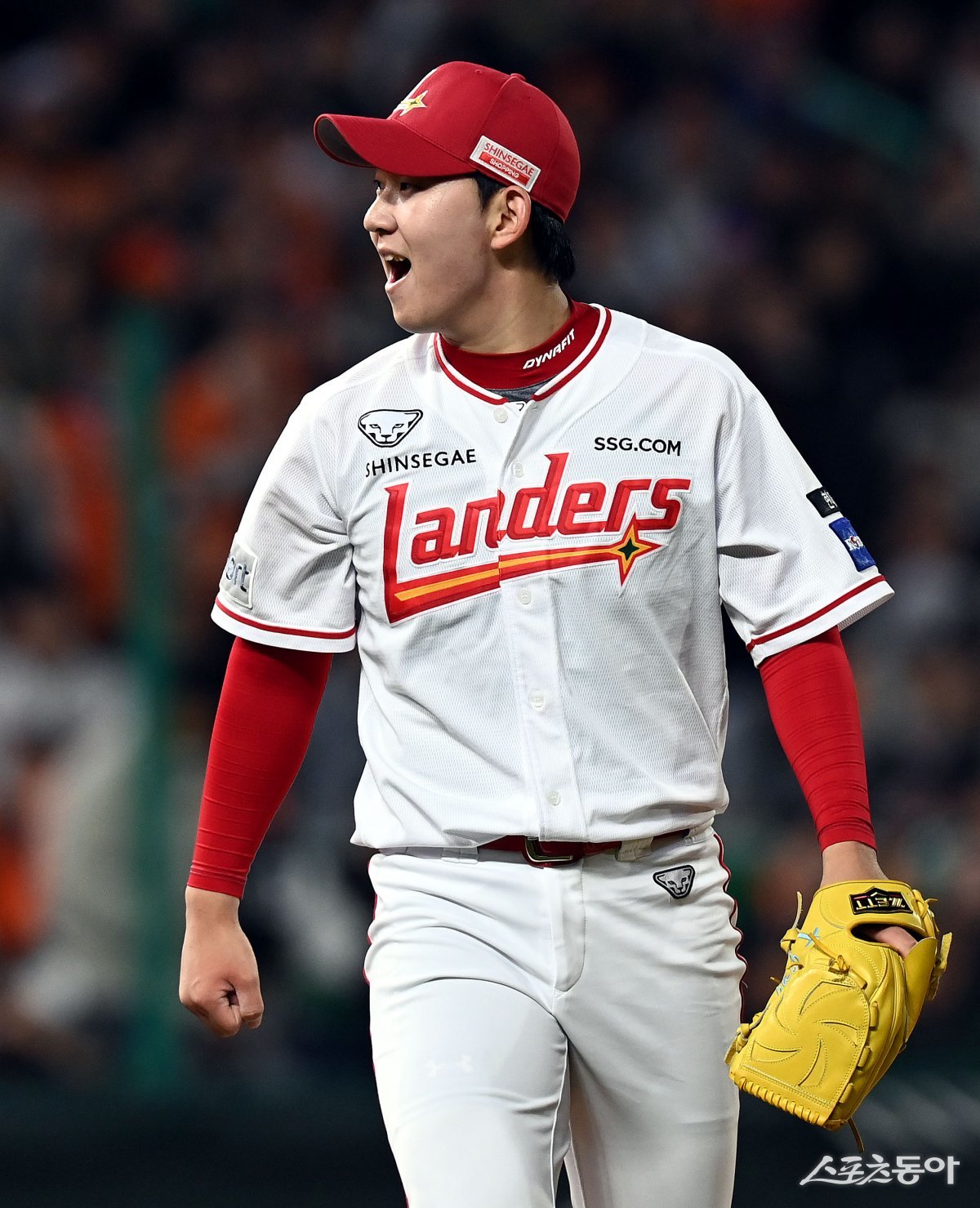 27일 인천 SSG 랜더스필드에서 ‘2024 신한 SOL 뱅크 KBO리그’ SSG 랜더스와 한화 이글스의 경기가 열렸다. 5회초 2사에서 SSG 송영진이 삼진 아웃으로 이닝 종료 후 환호하고 있다.